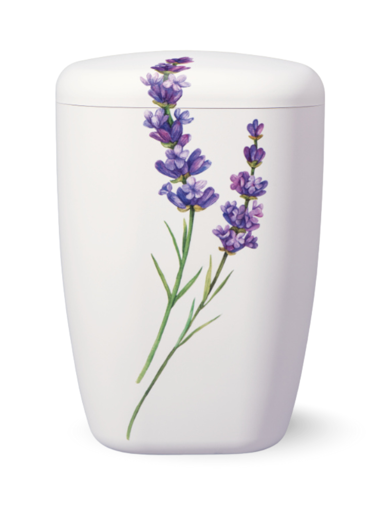 má matný povrch v bílé barvě a je zdobena jemným motivem levandule. Motiv levandule je v akrylovém barevném provedení. Celá urna tak působí velmi přírodně a jemně.