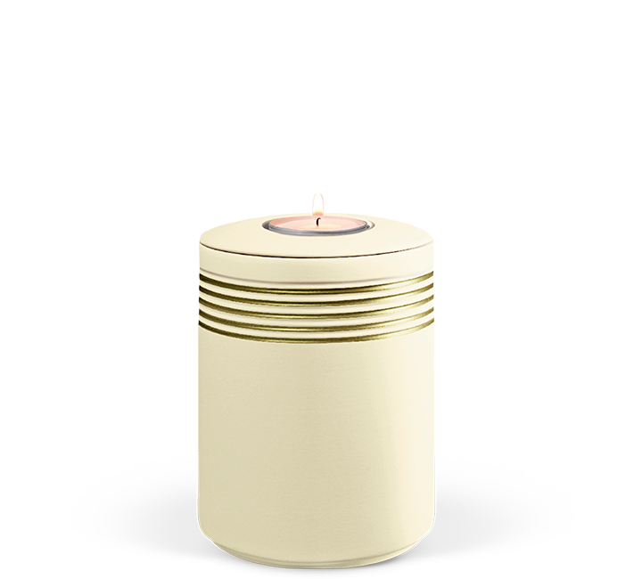 má zajimavý mořský design, který je doplněný zlatým lemováním na krémovém povrchu. Miniurna má vlastní svíčku na víku.
