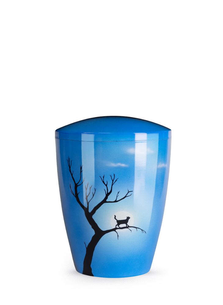 má povrch v černé barvě, který je zdoben ručně malovaným motivem kočky a duhy za pomocí malířské techniky airbrush. Airbrush neboli americká retuš, je malířská technika využívající malé pistole ke stříkání barvy pomocí stlačeného vzduchu. Urna je vhodná pro popel zvířátka do 10 kg.