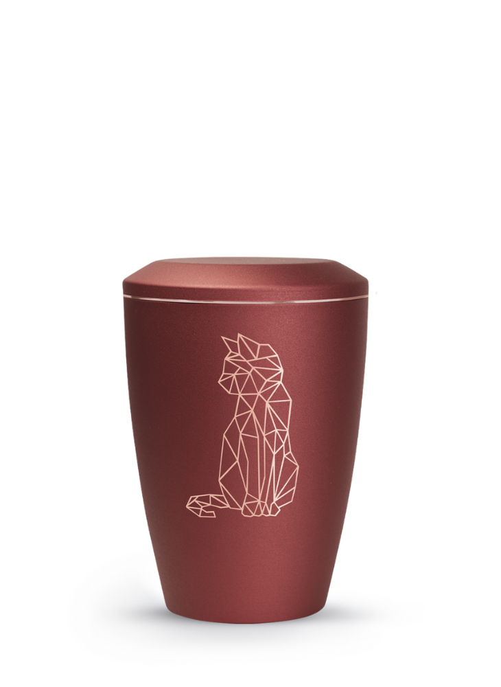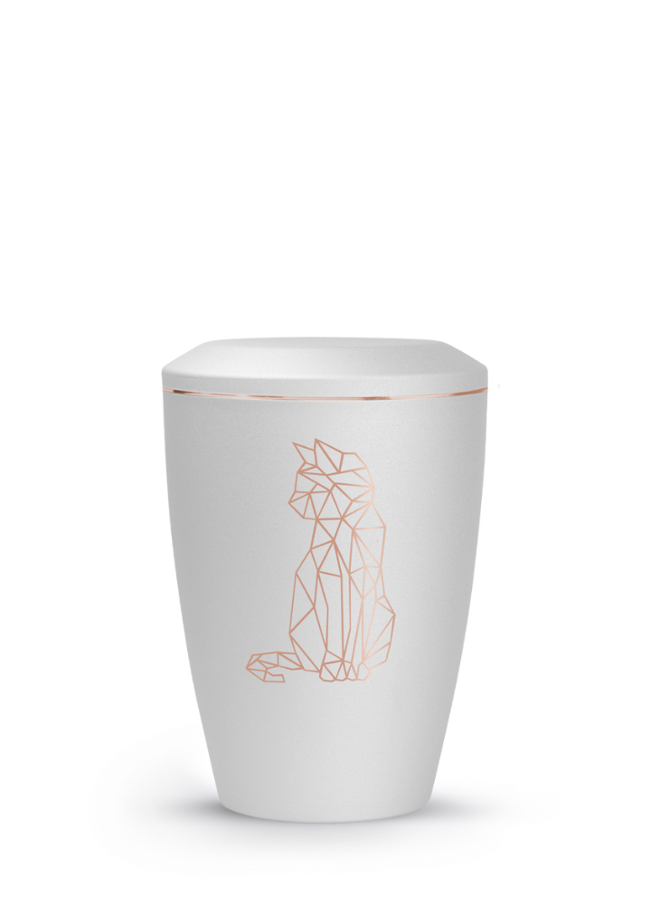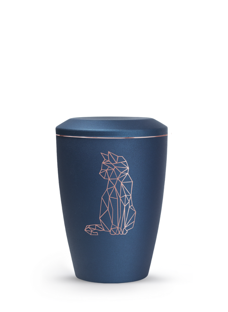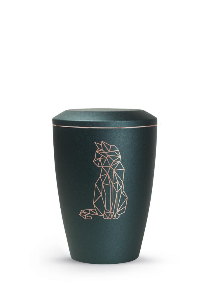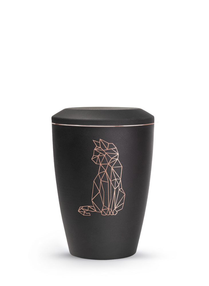 má jedinečný třpytivý povrch v černé barvě s geometrickým měděným motivem kočky. Jsou specifické svou jednoduchostí a nadčasovostí. Urna je vhodná pro popel zvířátka do 10 kg.
