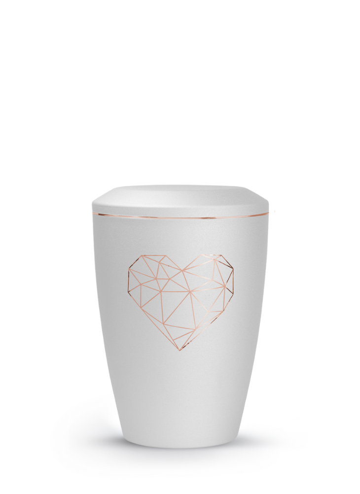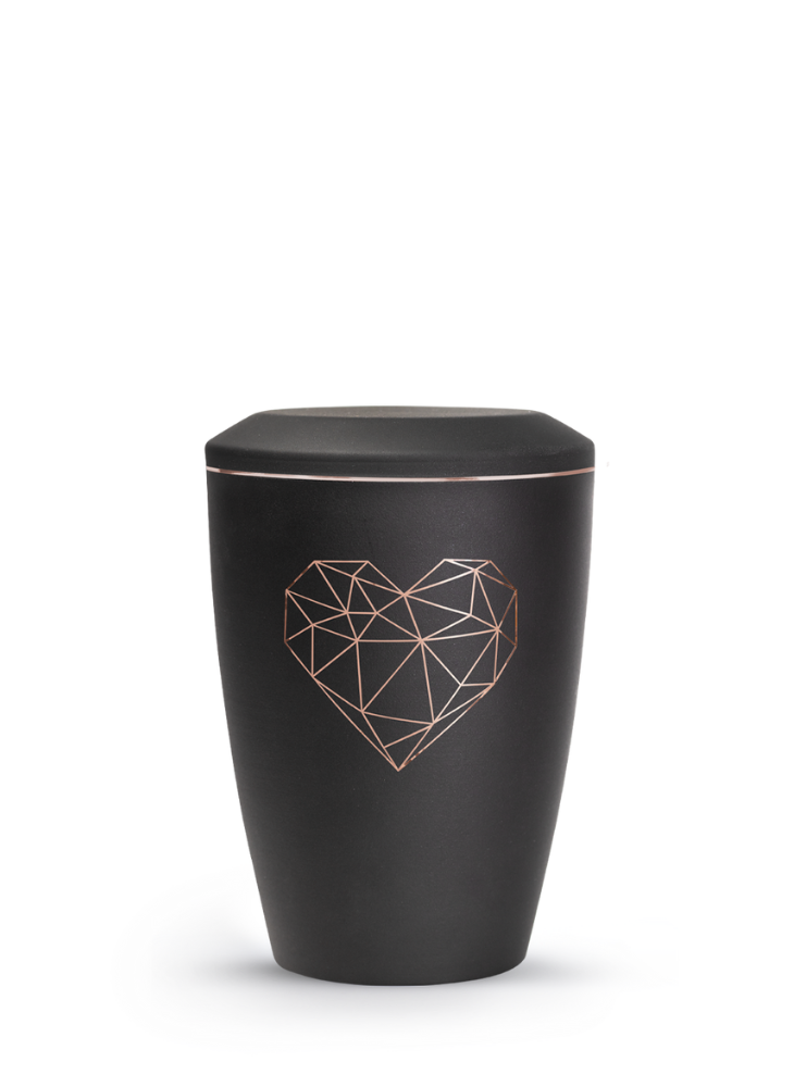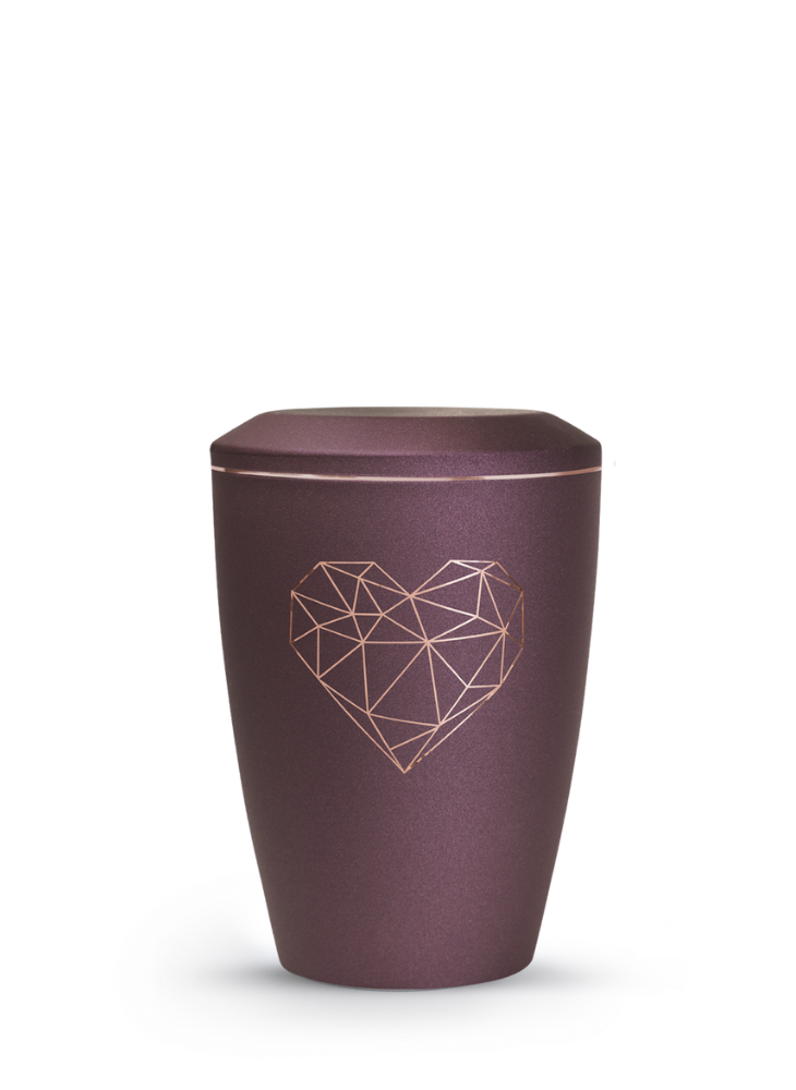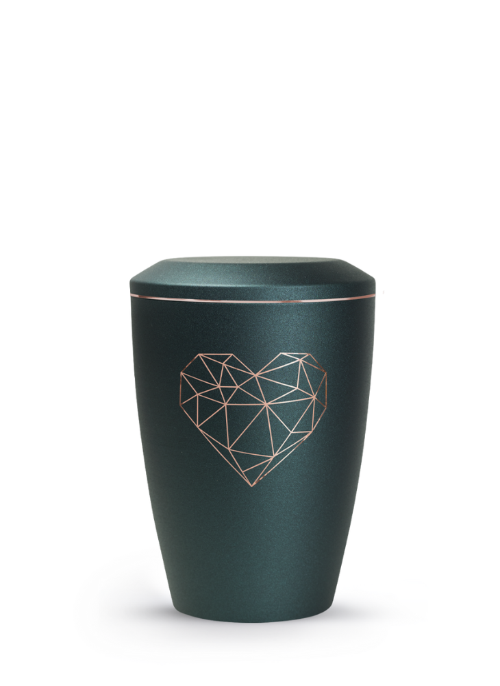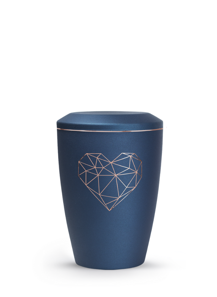 má jedinečný třpytivý povrch v modré barvě s geometrickým měděným motivem srdce. Jsou specifické svou jednoduchostí a nadčasovostí. Urna je vhodná pro popel zvířátka do 10 kg.