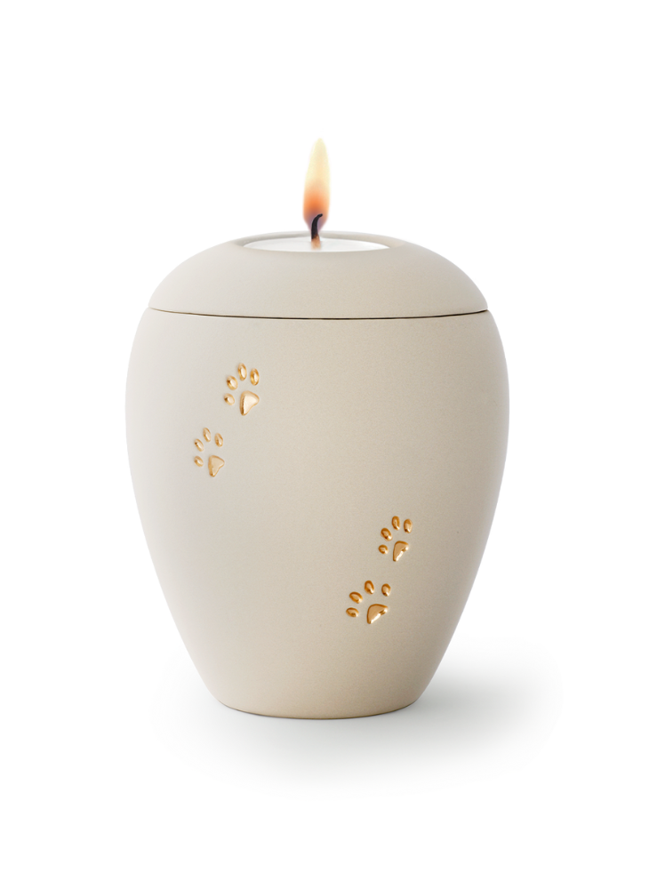 Keramická urna Siena Paws se svíčkou má sametový povrch v zelené barvě se zlatým motivem tlapek a se svíčkou na víku.