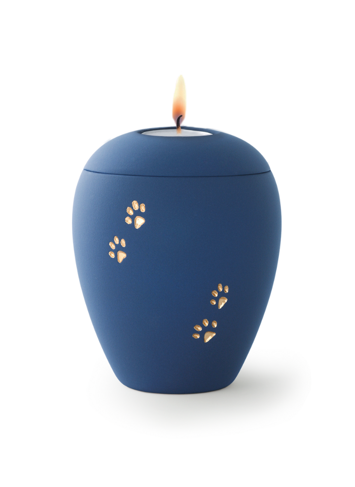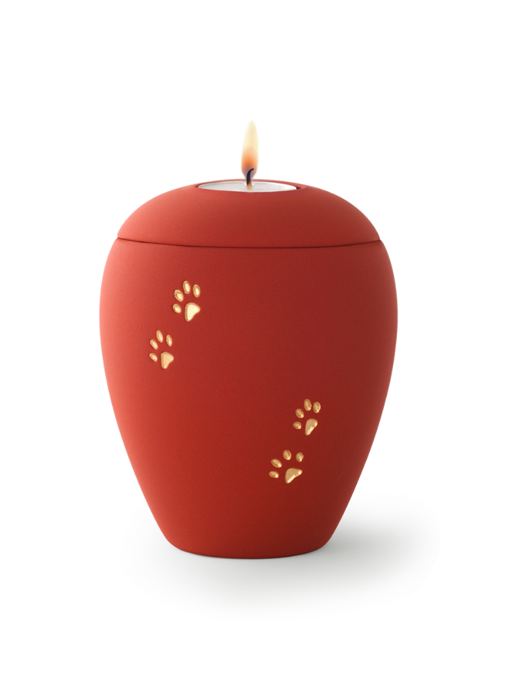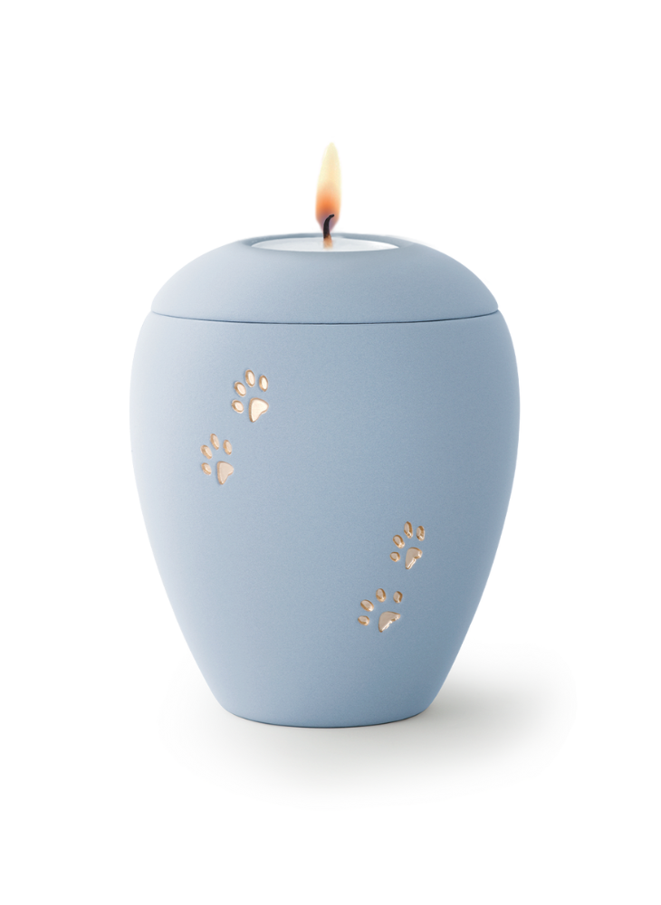 má sametový povrch v zelené barvě se zlatým motivem tlapek a se svíčkou na víku. Jsou specifické svou jednoduchostí a elegancí. Urna je vhodná pro popel zvířátka od 10-30 kg.